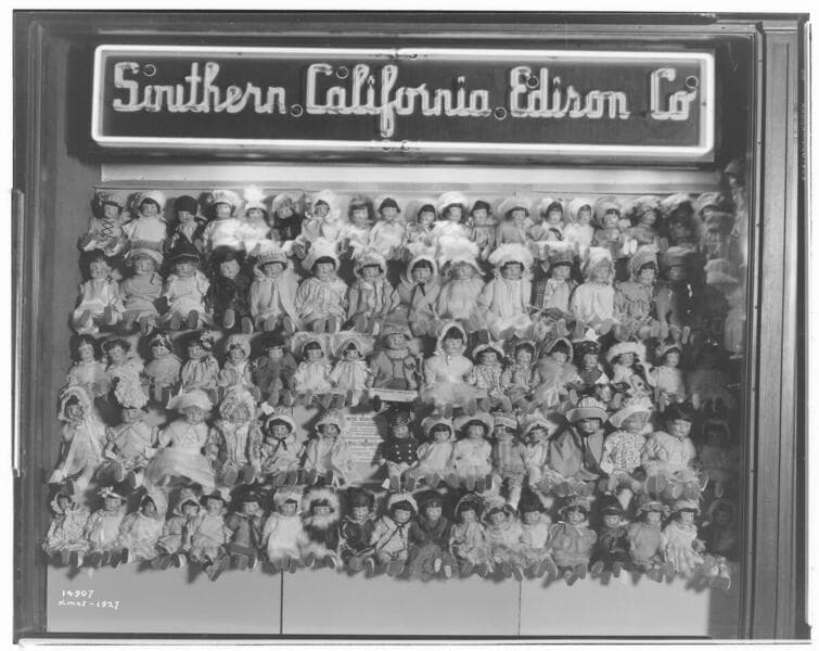 D2.3 - Displays, Window - Edison Christmas doll dressing contest - Inspecting dolls.