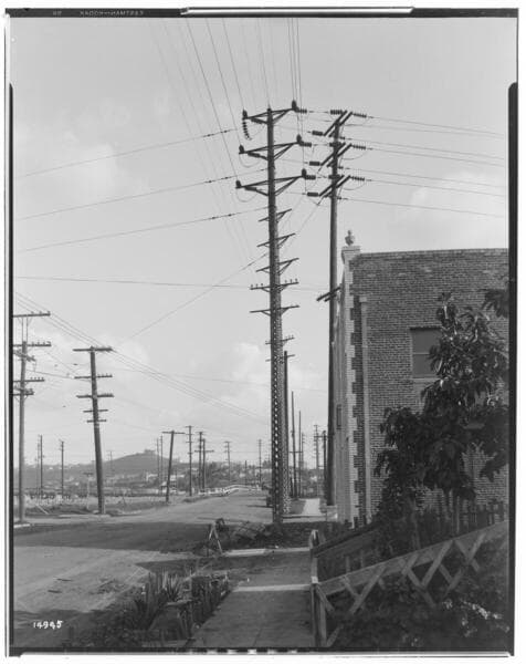 Distribution Lines - Triparite steel poles [ An area view of the east bank of the Los Angeles River, looking south, showing joint poles and the end of the trolley wire (either UP, G & M, or PE). It shows the end of UP Glendale Line, electrification.]