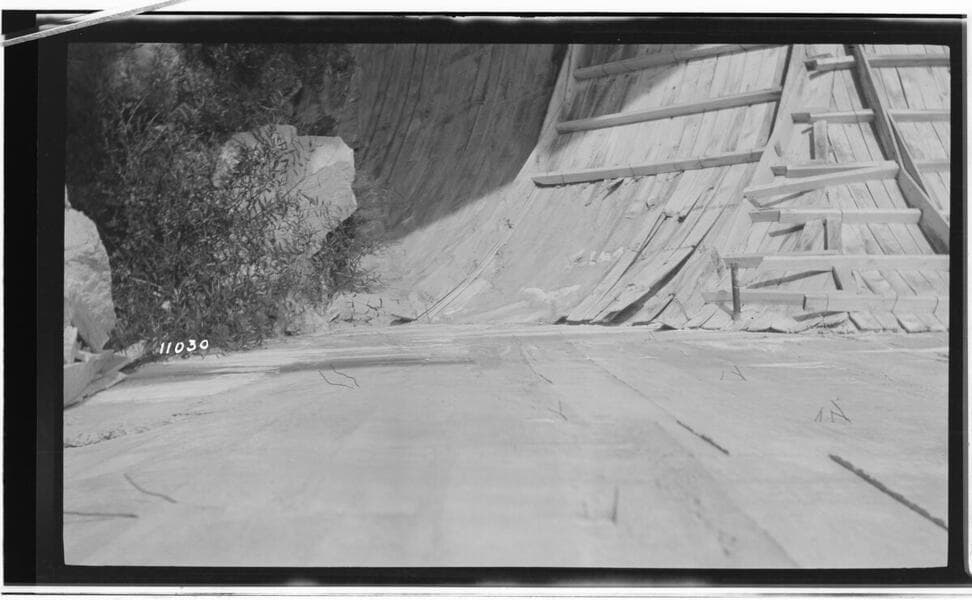 Power Producers - Not SCE - Bear Valley Dam [Big Bear Dam - San Bernardino - Entrados of one arch with wood forms in place. Possibly during construction of original multiple-arch dam.]