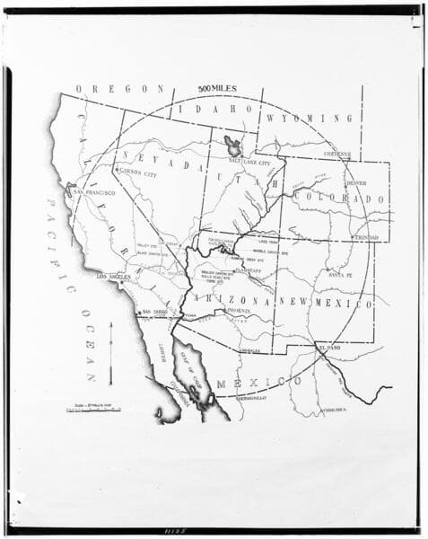 Colorado River - 500 mile circle map [showing proposed dam sites for the Colorado River Projects.]