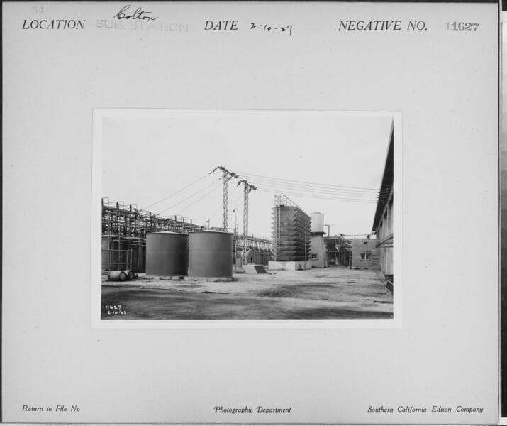 Redlands Substation - Redlands - Steam plant property. The two fuel oil tanks, the cooling tower, and condenser reservoir were located just north of the powerhouse.