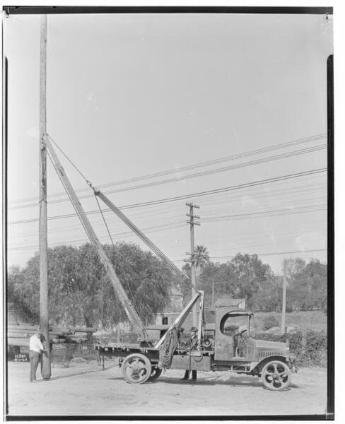 "Take Off" loading poles on "dolly" at the Whittier Railroad Station. derrick with trailer.