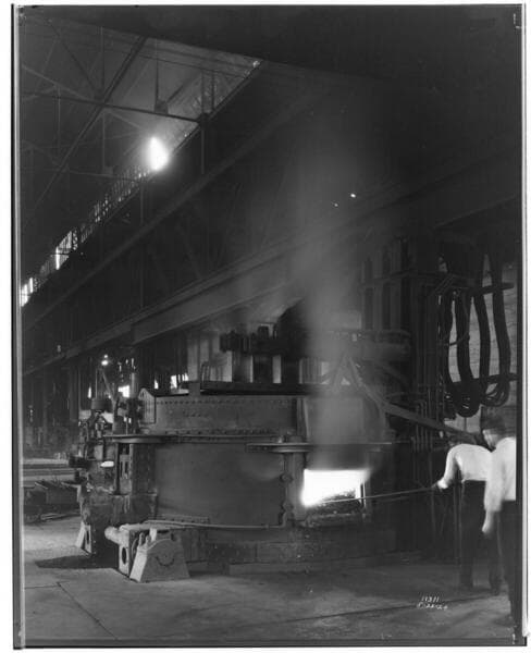 H1.1 - Heavy Duty Industrial misc. - Union Tool Co. - [Pouring molten steel from] Electric furnace. [3 electrodes are inserted at the top of furnace melting the scrap steel]