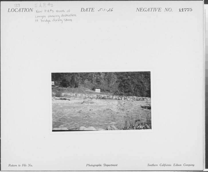 Santa Ana River #3 Powerhouse - Destruction of bridge leading to Powerhouse #2 during storm.