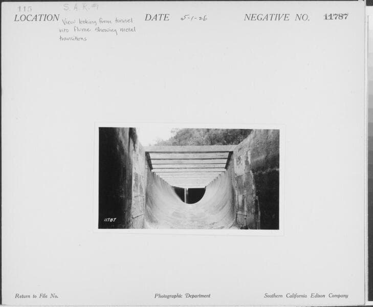Santa Ana River #1 Powerhouse - View of metal [flume] transition and entrance to tunnel.