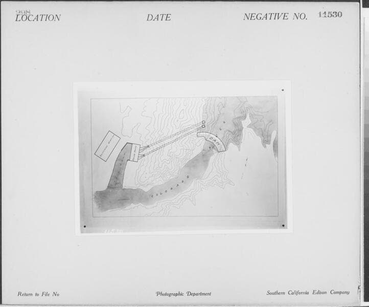 Colorado River - Copy of proposed layout of Black Canyon Dam and Powerhouse Sites. [Sketch shows an earlier proposed layout for Boulder Dam. This version placed all of the generation facilities on the Nevada side.] .
