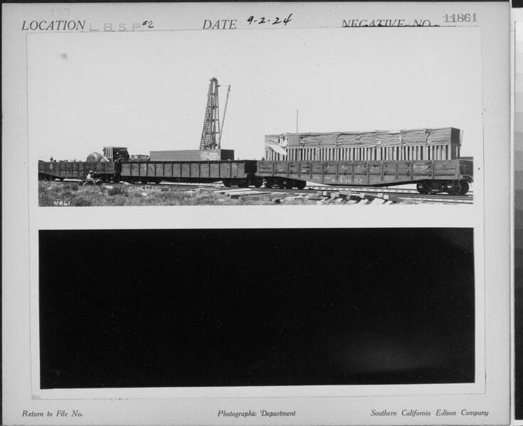 Long Beach Steam Station, Plant #2 - Two cars [flat-car and gondola with turbine parts, 1 panorama shot on photocard]