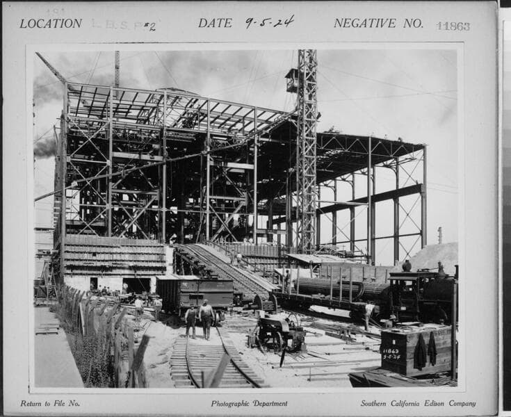Long Beach Steam Station, Plant #2 - showing first boiler drum going up incline railroad to 2nd floor.