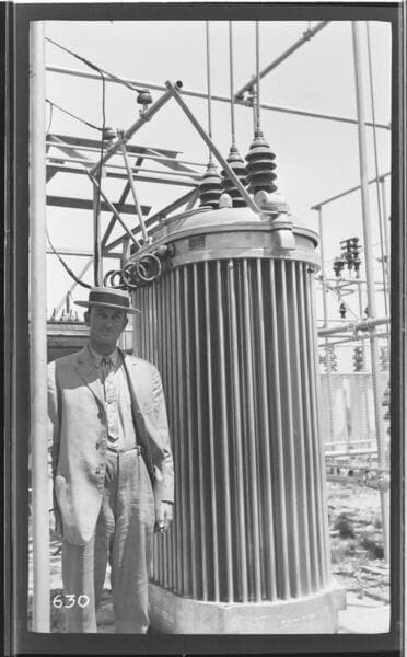 Man standing by electric substation - Ice House & Flour mill across street. Unpaved