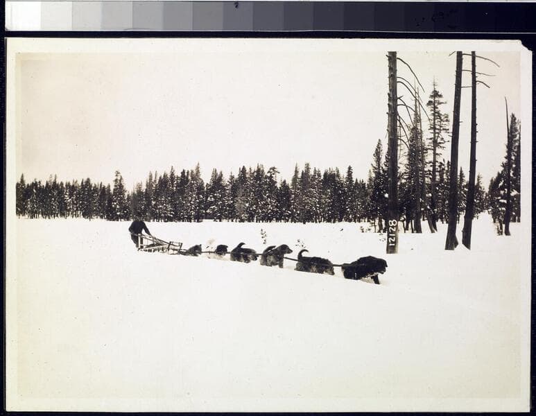 Big Creek Dog Teams - Jerry Dwyer & dog team - Alaskan dog team used for transporting mail and essential small supplies over snow in the higher Florence Tunnel region.