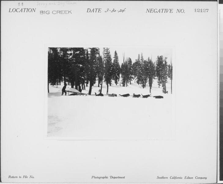 Big Creek Dog Teams - Alaskan "sourdough" Jerry Dwyer with his sled and full team of seven sled dogs. [Two of his dogs died during the time Jerry worked at Big Creek.]