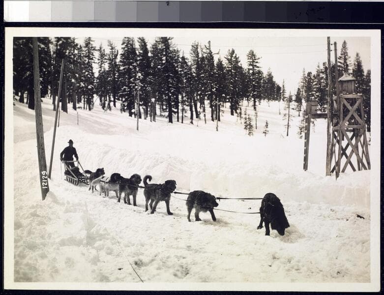 Big Creek Dog Teams - Jerry Dwyer & dog team - Alaskan dog team used for transporting mail and essential small supplies over snow in the higher Florence Tunnel region.