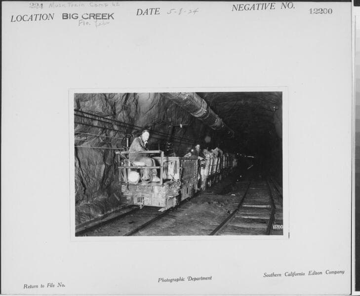 Big Creek, Florence Lake Dam - Tunnel crew at Camp 62 eating on Lunch Train.
