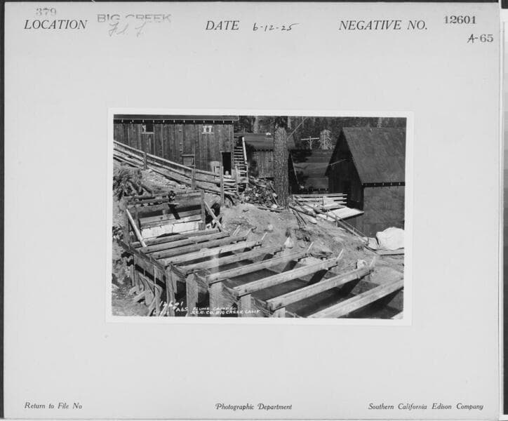 Big Creek, Florence Lake Dam - Discharge into rock area at edge of Huntington Lake from temporary wooden flume (Camp 60). (1300 cfs)