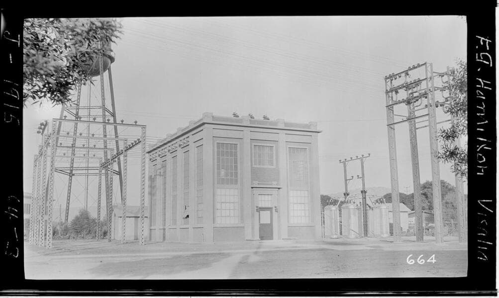 The exterior of the Exeter Substation, showing the distribution lines and an operating crew.