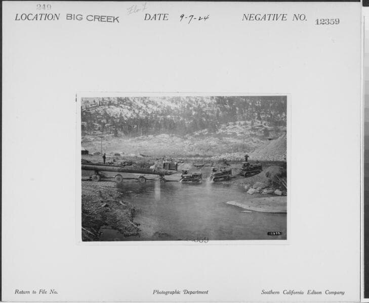 Big Creek, Florence Lake Dam - Tractors towing trailers carrying Williamette Donkey & skids from Florence Lake Reservior.
