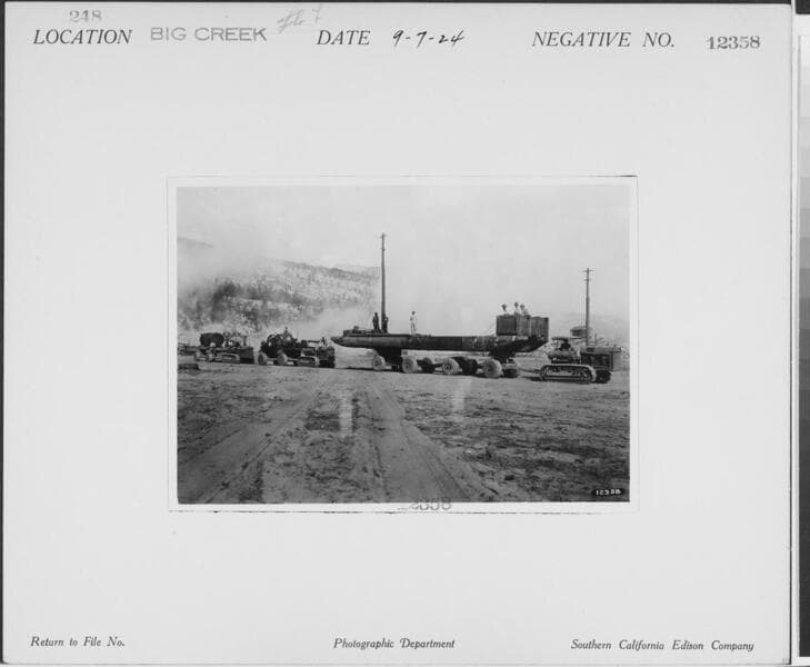 Big Creek, Florence Lake Dam - Tractors towing trailers carrying Williamette Donkey & skids from Florence Lake Reservior.