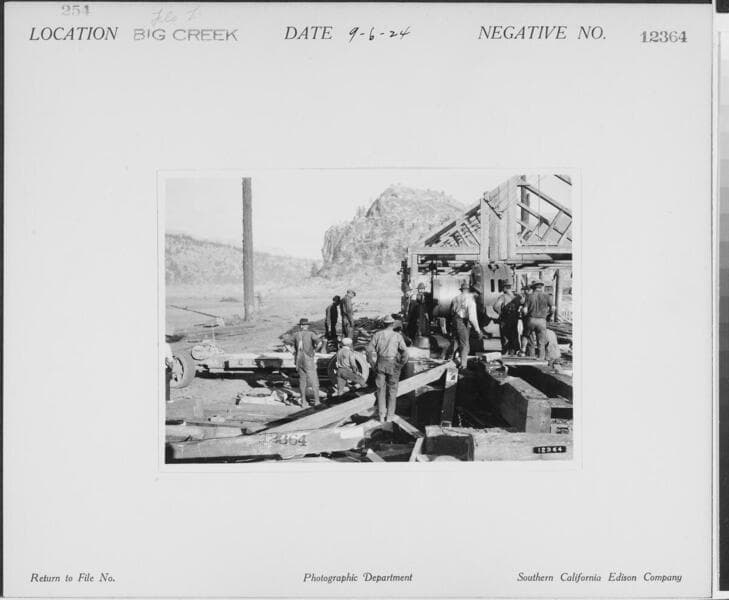 Big Creek, Florence Lake Dam - Loading 300 HP motor onto trailer Camp #65 Sawmill.