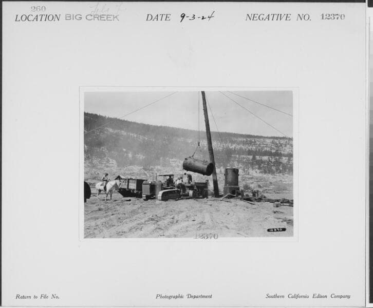 Big Creek, Florence Lake Dam - Loading 300 HP motor onto trailer Camp #65 Sawmill.