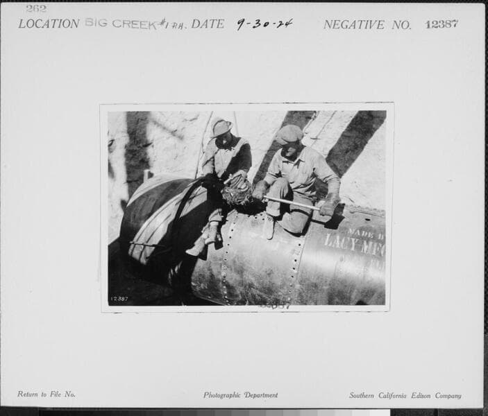 Big Creek #1 - Flowline for 4th Unit, Powerhouse #1 - Worker holding [bucking] rivet inside flowline.
