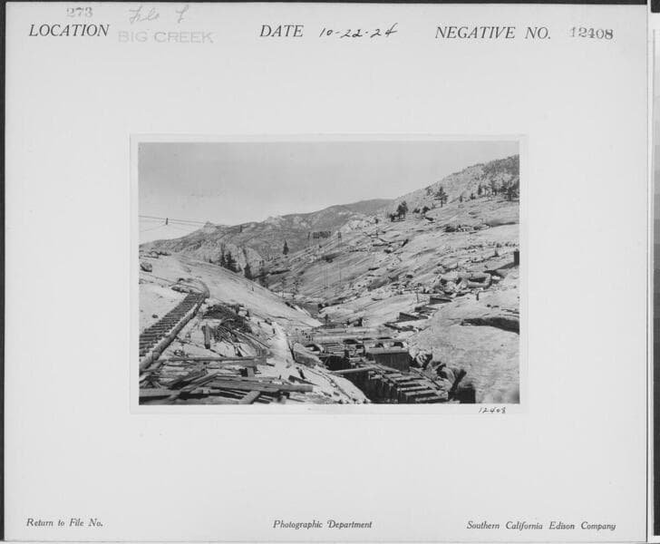 Big Creek - Florence Lake Dam and Dam #2 [Construction of Florence Dam, main river channel, "Frog Pond" section, River Gorge section, trench for buttress 52, Insley tower at Frog Pond, tunnel intake, Camp 64 Hospital and ambulance, construction on diversion dam for intake, proposed wood stave flowline from Florence to Shaver Lake, Camp 62, tunnel excavation, logging reservoir site, Camp 65 sawmill, Camp 60 warehouse]