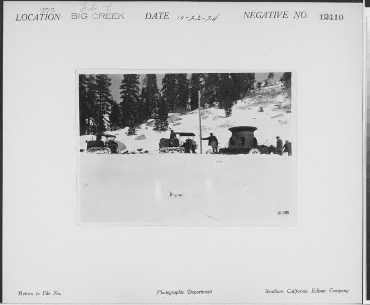 Big Creek, Florence Lake Dam - [Pair of "Best" Tractors] hauling trailer with #9 Crusher over Kaiser Pass to Florence Lake Dam after one of the early snows.
