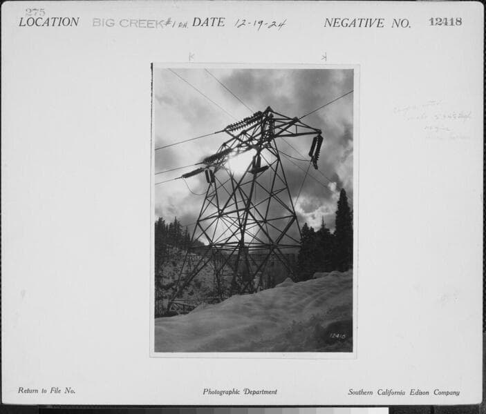 Substations; Big Creek Powerhouse 1 and Powerhouse 2 construction and penstock construction, Huntington Lodge and Huntington Lake, heavy snowfall, break in Powerhouse 1 penstock joint, Construction of Dam 1, 2, and 4; incline railroad, railroad locomotives, Construction of Big Creek transmission line; Magunden Substation; Kern transmission line poles, line and railroad wash out at Arroyo Seco; Long Beach Steam Plant; Los Angeles Aqueduct and Powerhouse; Pacific Light and Power vehicles; Intake Azusa Plant, Azusa Powerhouse interior; Highgrove forebay and Powerhouse; Stone Castle; Sierra Powerhouse interior, operator's cottages; Pedley Powerhouse; Mentone Powerhouse; Borel Powerhouse.