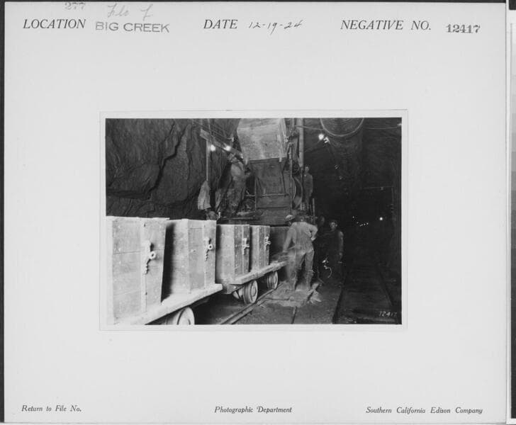 Big Creek, Florence Lake Dam - Loading batch cars with concrete for the lining of Florence Lake [Ward] Tunnel, Camp #62