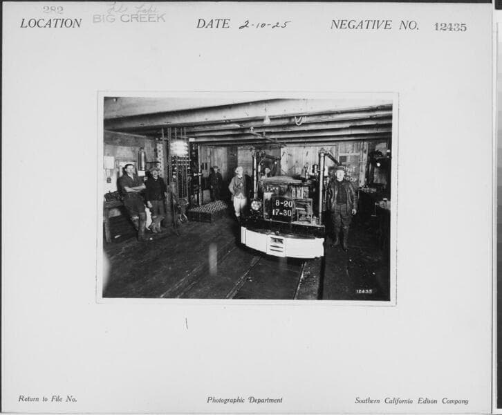 Big Creek, Florence Lake Dam - Misters Davis, Heckman and Kruger [on electric tram in Florence lake tunnel] on way to heading, Camp 60.