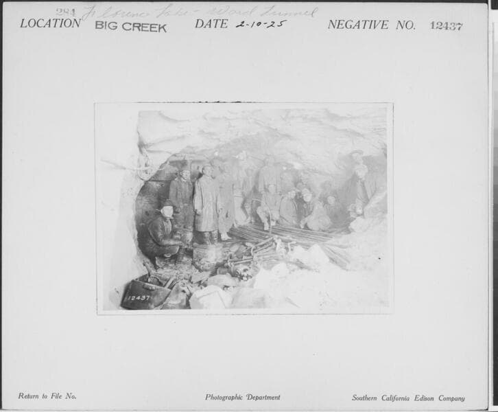 Big Creek, Florence Lake Dam - Tunnel crew on muck pile after breaking thru between 60 and 61.