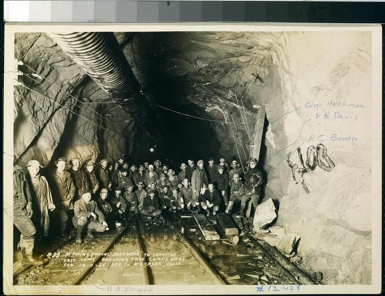 Big Creek, Florence Lake Dam - Tunnel crew on muck pile ater breaking thru between 60 - 61.