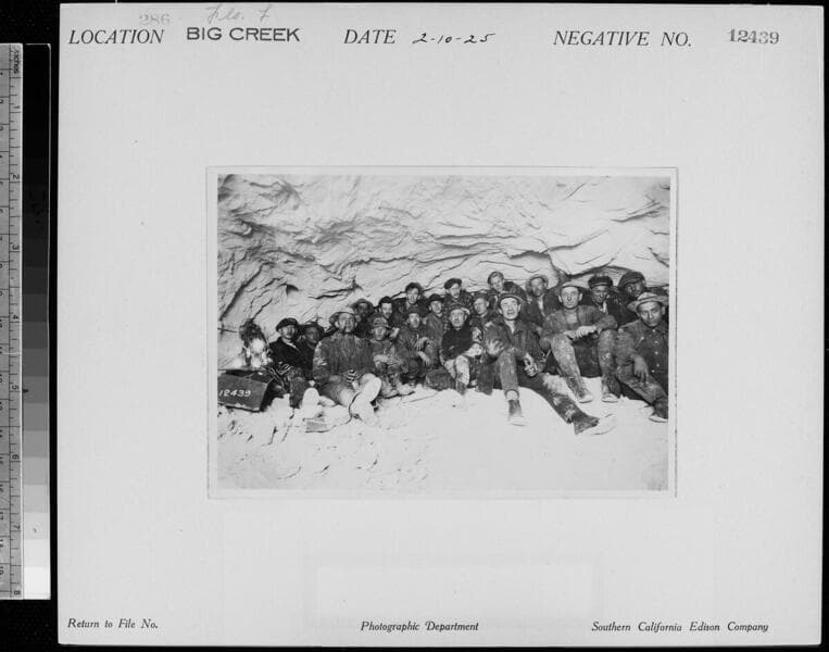 Big Creek, Florence Lake Dam - Tunnel crew on muck pile ater breaking thru between 60 - 61.