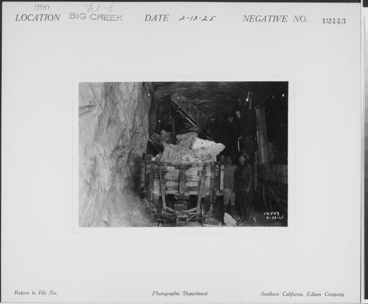 Big Creek, Florence Lake Dam - Shovel loading muck car in Florence Lake Tunnel.