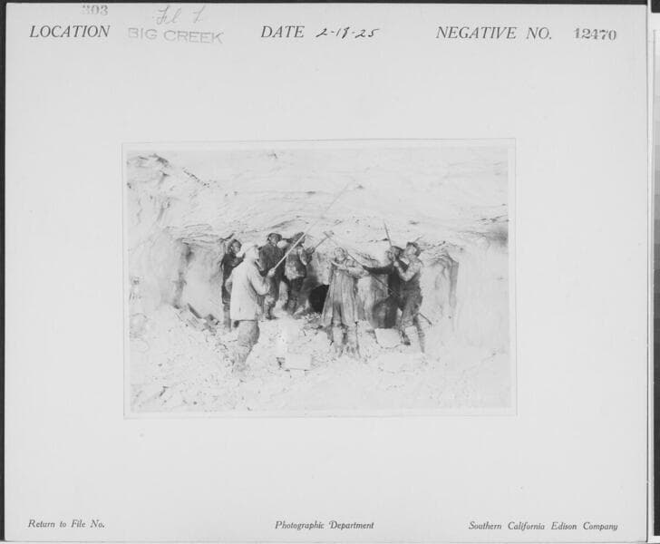 Big Creek, Florence Lake Dam - Tunnel crew on muck pile after breaking thru between 60 and 61.