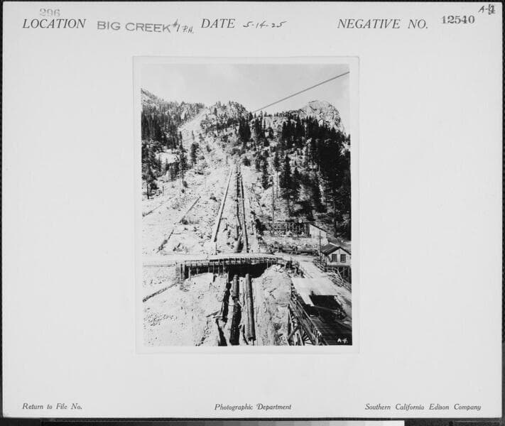 Big Creek #1 - General view of Powerhouse #1 and penstock #1 [with Unit 4 running]