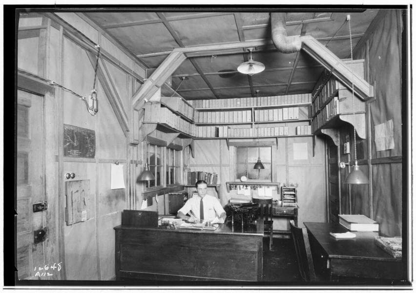 Big Creek, Miscellaneous - Commissary in new recreation hall at Cascada. [front counter of storeroom with chocolate, gum, snacks, shaving creme, and tobaco on the shelves]