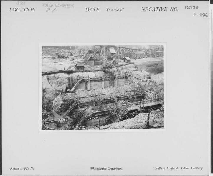 Big Creek, Florence Lake Dam - View looking North showing erection of forms for construction above early spring work on Arches 13 & 14, excavation for Arch 15, tramway trestle, West mixing plant, and West chuting towers in background, interados forms being erected for Arch 13, and concrete placing for Buttress 12 in progress.