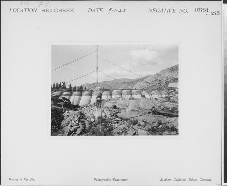 Big Creek, Florence Lake Dam - Building forms [for Arches] - River Section. [View along line of Arches while concrete is being chuted into forms]
