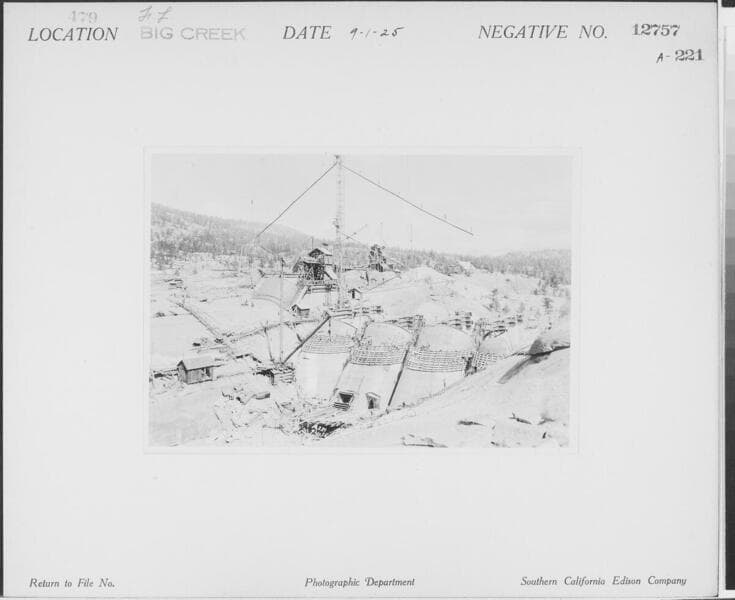 Big Creek, Florence Lake Dam - [Progress on multiple-arch dam construction, in River Section showing 300' Tower, mixing plant and sluice gate on Arch #53.]
