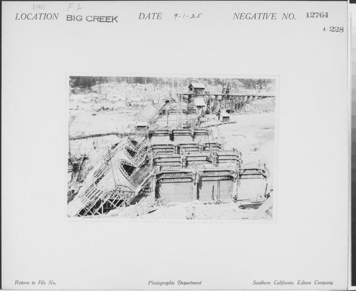 Big Creek, Florence Lake Dam - River Section, Florence Lake Dam - looking upstream - showing Mixer Plant on right.