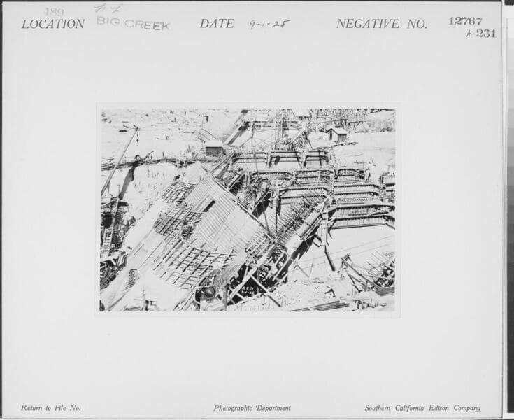 Big Creek, Florence Lake Dam - Closer view, looking west across river section from near Buttress 56. (Excavation for Arches 50, 51, & 52 shown ready for forms. Placing of lift in Buttress 55 has just been completed. Chutes shown in position for placing in Buttress 53.