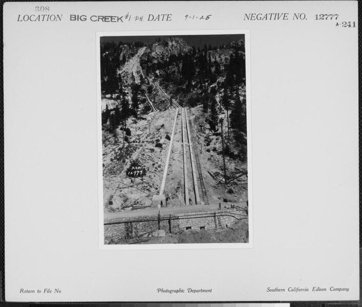 Big Creek Powerhouse #1 - [penstocks and Kerckhoff Dome from road across Big Creek].