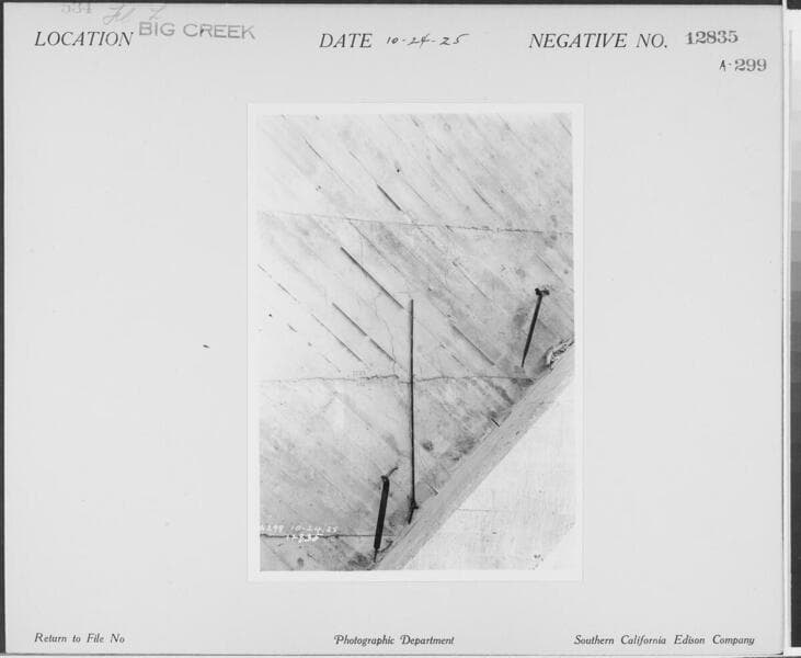 Big Creek, Florence Lake Dam - Record photo of typical vertical crack in 1" buffer gunite at base of river section arches. There are approximately 3 such cracks per arch. This particular crack is on Arch 55.