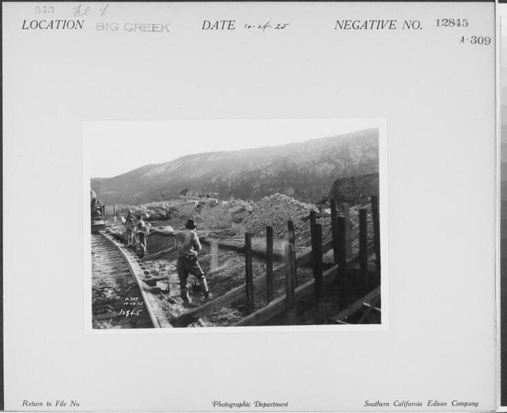 Big Creek, Florence Lake Dam - Photo showing backfilling in river channel. Building forms for east sluice gate extension.