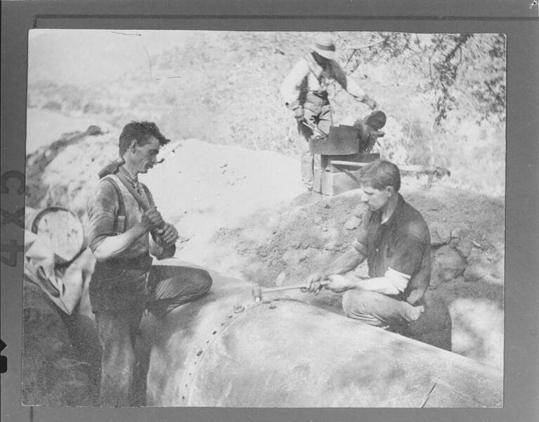 A construction crew riveting the pipeline at Kaweah #1 Hydro Plant