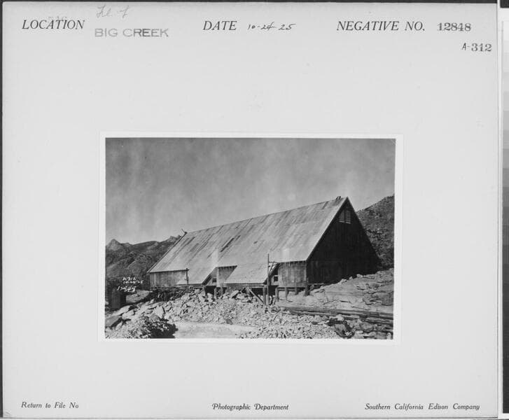 Big Creek, Florence Lake Dam - Looking across from Trestle toward cement warehouse.