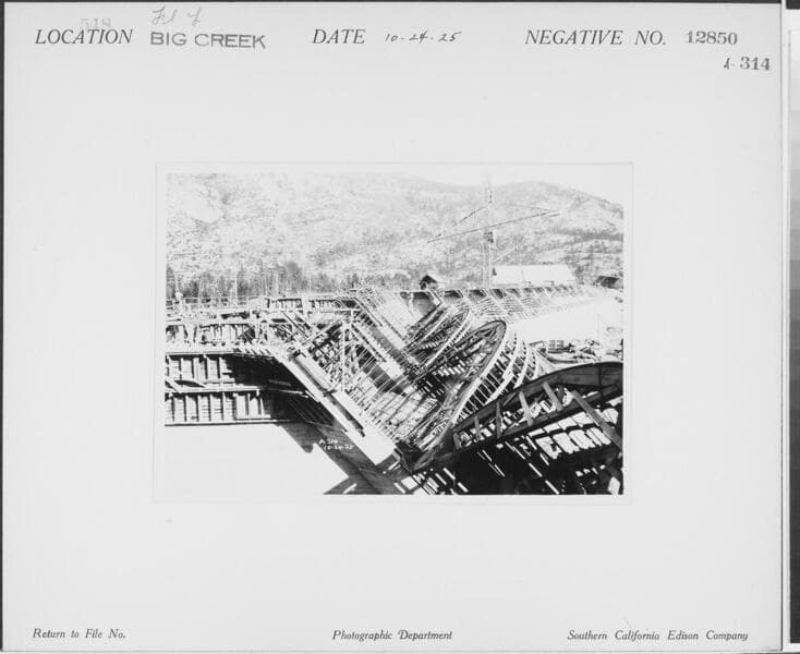 Big Creek, Florence Lake Dam - Constucting Arches and Buttresses. [Cement Warehouse in background]