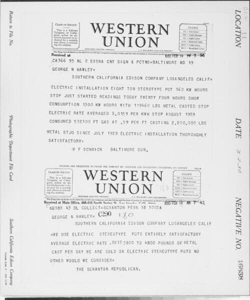 C1.2 - Letters - Western Union Telegram to SCE [regarding benefits of using electric heating in metalwork industry]
