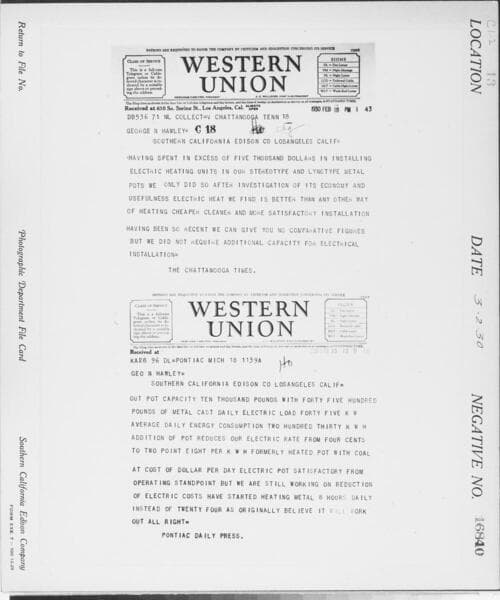 C1.2 - Letters - Western Union Telegram to SCE [regarding benefits of using electric heating in metalwork industry]