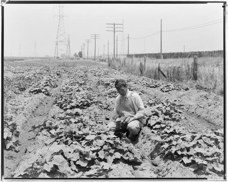 N1 - Nurseries & Soil Heating - Nursery of Toschio Yamabe. View of Japanese American man holding plant.